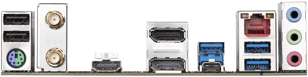 Разъёмы на задней панели: PS/2, 2 x USB 2.0, 3 x USB 3.2 Gen1, USB 3.2 Gen2 Type-C, HDMI, 2 x DisplayPort, RJ-45